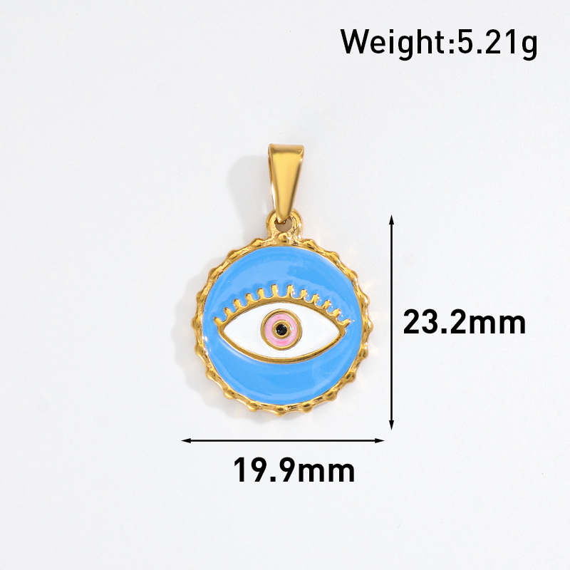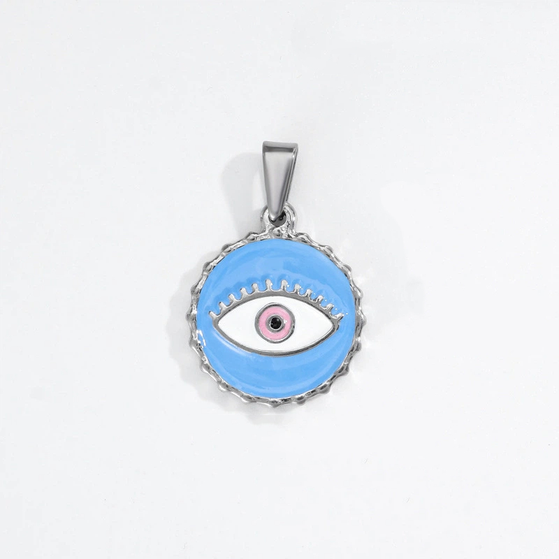 Read MoreThis pendant features a unique "Evil Eye" design. The outer ring is adorned with a delicate gold border, while the center displays a vibrant blue eye-shaped pattern. There are pink details in the middle of the eye. The overall shape is simple yet exudes a sense of power.