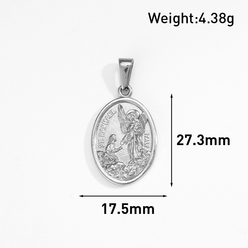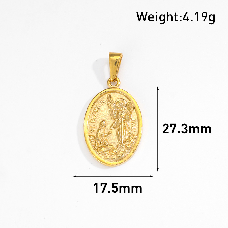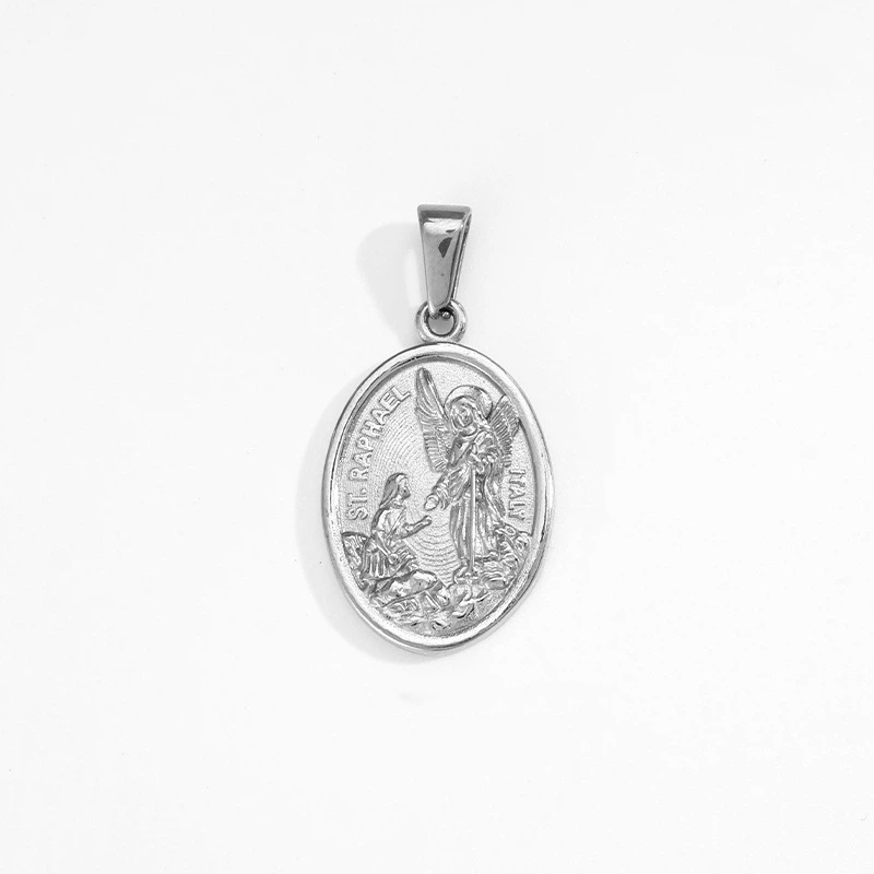 This oval-shaped San Rafael Angel pendant features exquisite relief craftsmanship to depict the details of religious figures, symbolizing protection and blessings. It is suitable for daily wear or as a religious gift for collection. Two options are available: gold and steel.