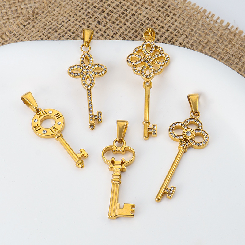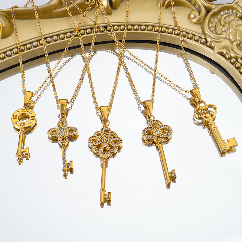 This clover-inspired key pendant combines symbolic elegance with a luxurious crystal-inlaid design. The four-petal motif represents luck and opportunity, while the key shape conveys access, success, and positive energy.