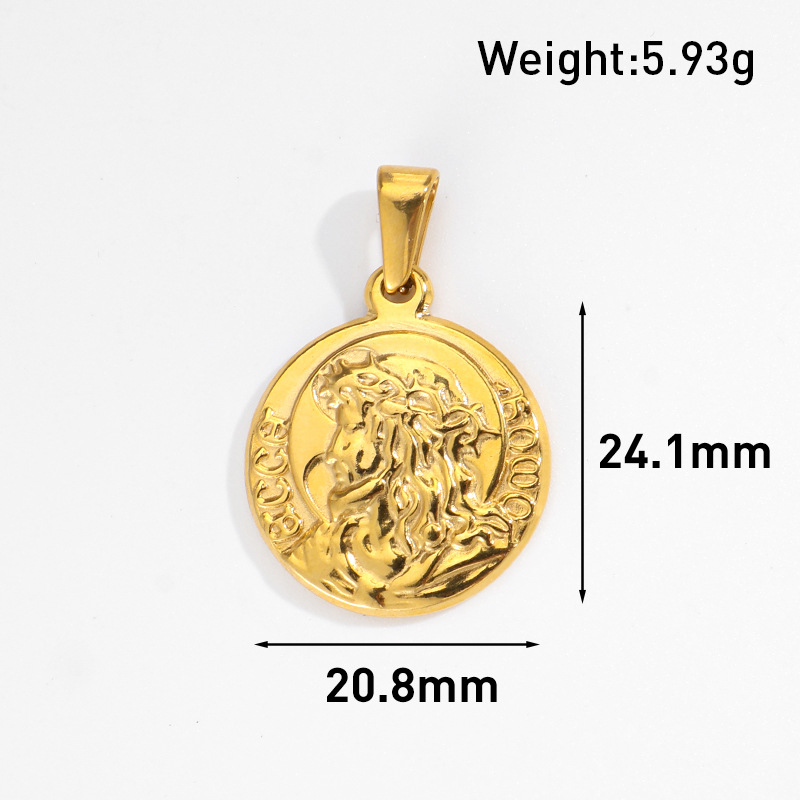 Read MoreThe overall shape is a circular commemorative medal-shaped pendant. In the center is a three-dimensional relief portrait, surrounded by engraved letters. Visually, it resembles the design of ancient coins.
