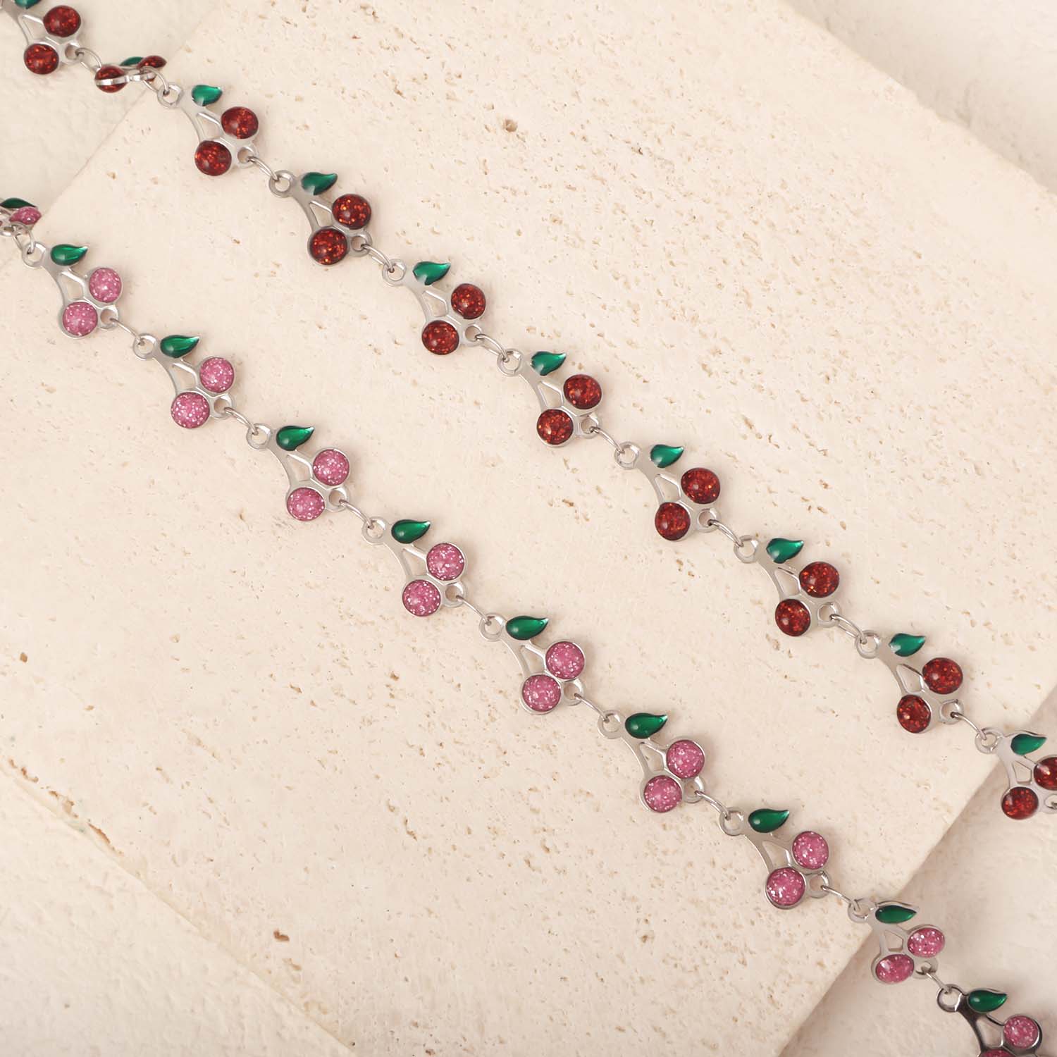 Inspired by natural cherry vines, this bracelet features small rounded cherry motifs connected by delicate vine links. The design feels light, playful, and well-balanced, hugging the wrist comfortably without stiffness.