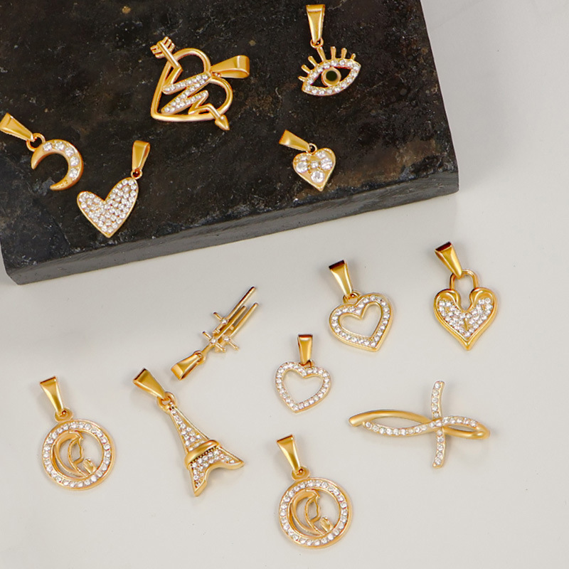 This heart shaped stainless steel pendant is based on stainless steel with a gold plated surface. Diamonds are inlaid on the edge of the heart shaped pendant, and the center is made of mother of pearl. Combining luxurious diamonds, warm mother of pearl and metal texture, the design is exquisite and romantic, and it is a jewelry that combines fashion sense and emotional meaning.