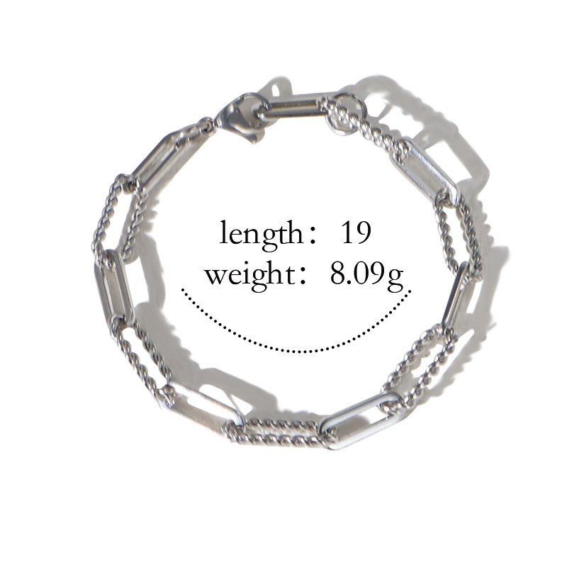 Material: This bracelet features a combined structure of twisted links and rectangular chain links. By blending classic chain elements with refined detailing, the twisted links enhance metallic reflections through spiral textures, while the rectangular links add a clean and structured visual balance. The overall design stays minimal yet distinctive, making it suitable for everyday wear.