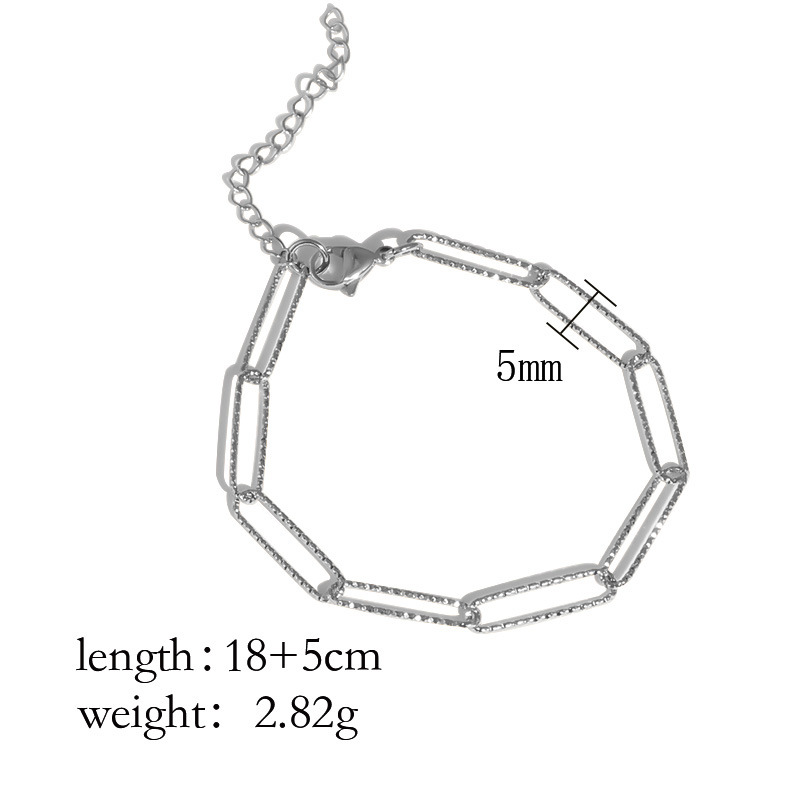 This bracelet features a slim flat elongated link design with clean lines and a lightweight appearance. The 5mm width offers a delicate and refined look without feeling bulky on the wrist. Equipped with an adjustable extension chain, it provides flexible sizing and comfortable wear. Suitable for wearing alone or layering with other bracelets, making it a practical and stylish basic chain for daily use.